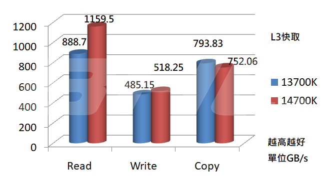 ,L2 快取Read為1418.9GB/s Write 622.43 GB/s Copy 961.11GB/s 延遲3.7ns, L3 快取Read為1159.5GB/s Write 518.25 GB/s Copy 752.06GB/s 延遲14.9ns。