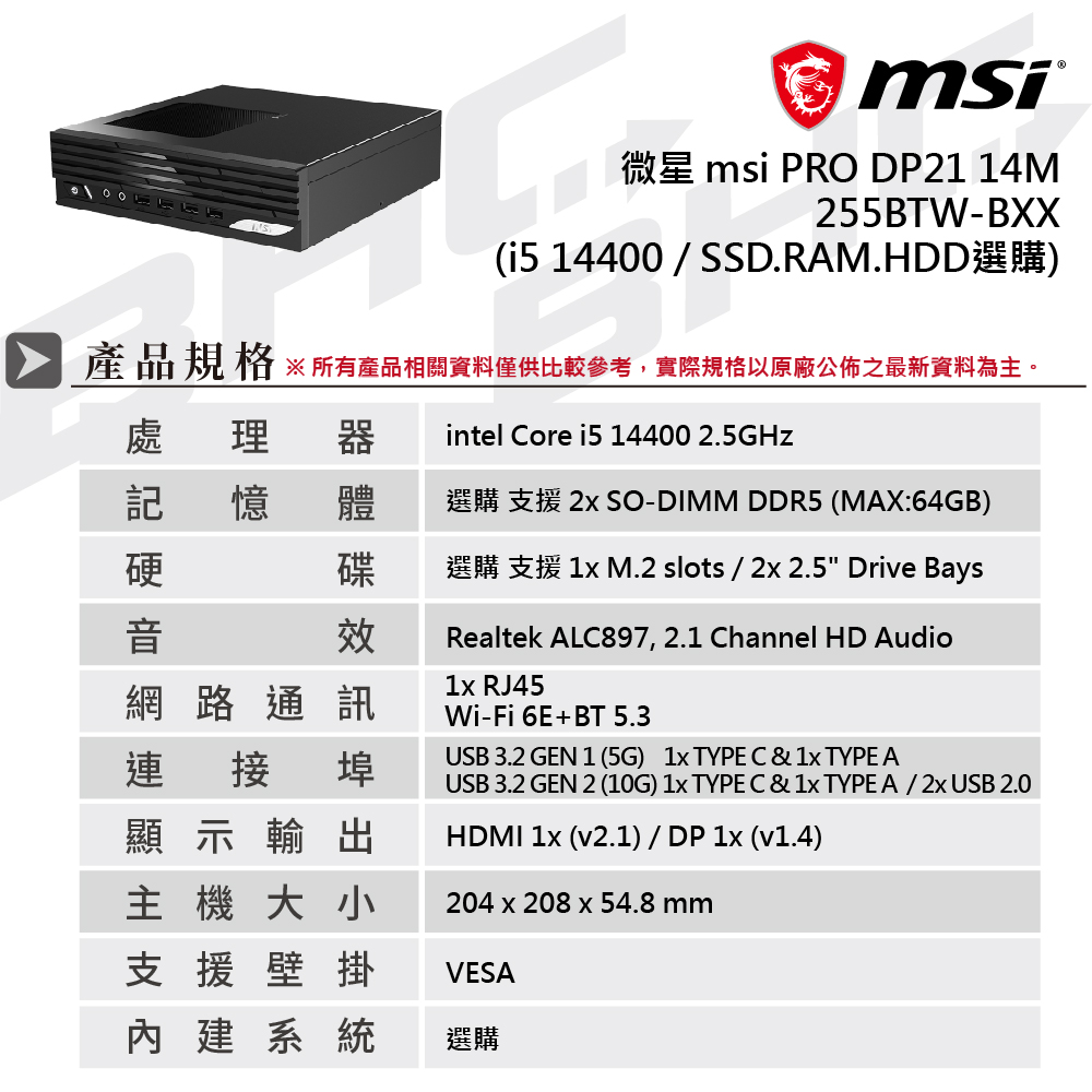 微星 msi PRO DP21 14M-255BTW-BXX(I5-14400【SSD.RAM(D5).HDD選購】)