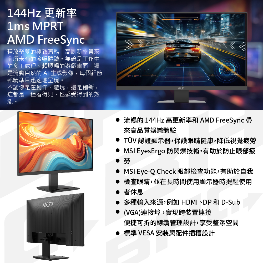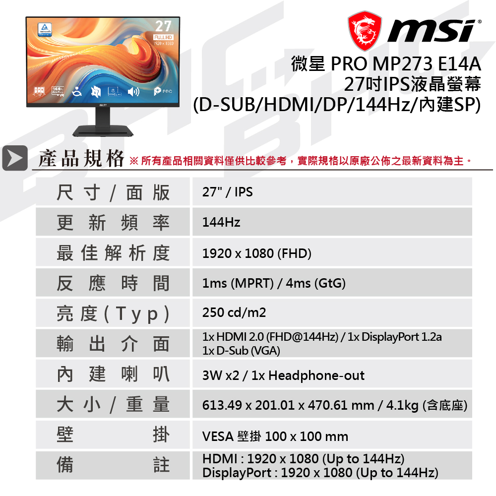 微星 PRO MP273 E14A(D-SUB/HDMI/DP/144Hz//內建SP)27吋IPS液晶螢幕