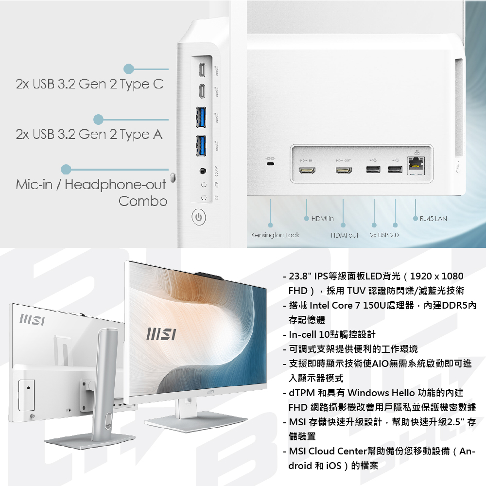微星 Modern AM242TP 1M-1211TW-W5120U8GS1TX11PAMS(23.8"Core 5-120U/8G/1TB/Win11 P)白