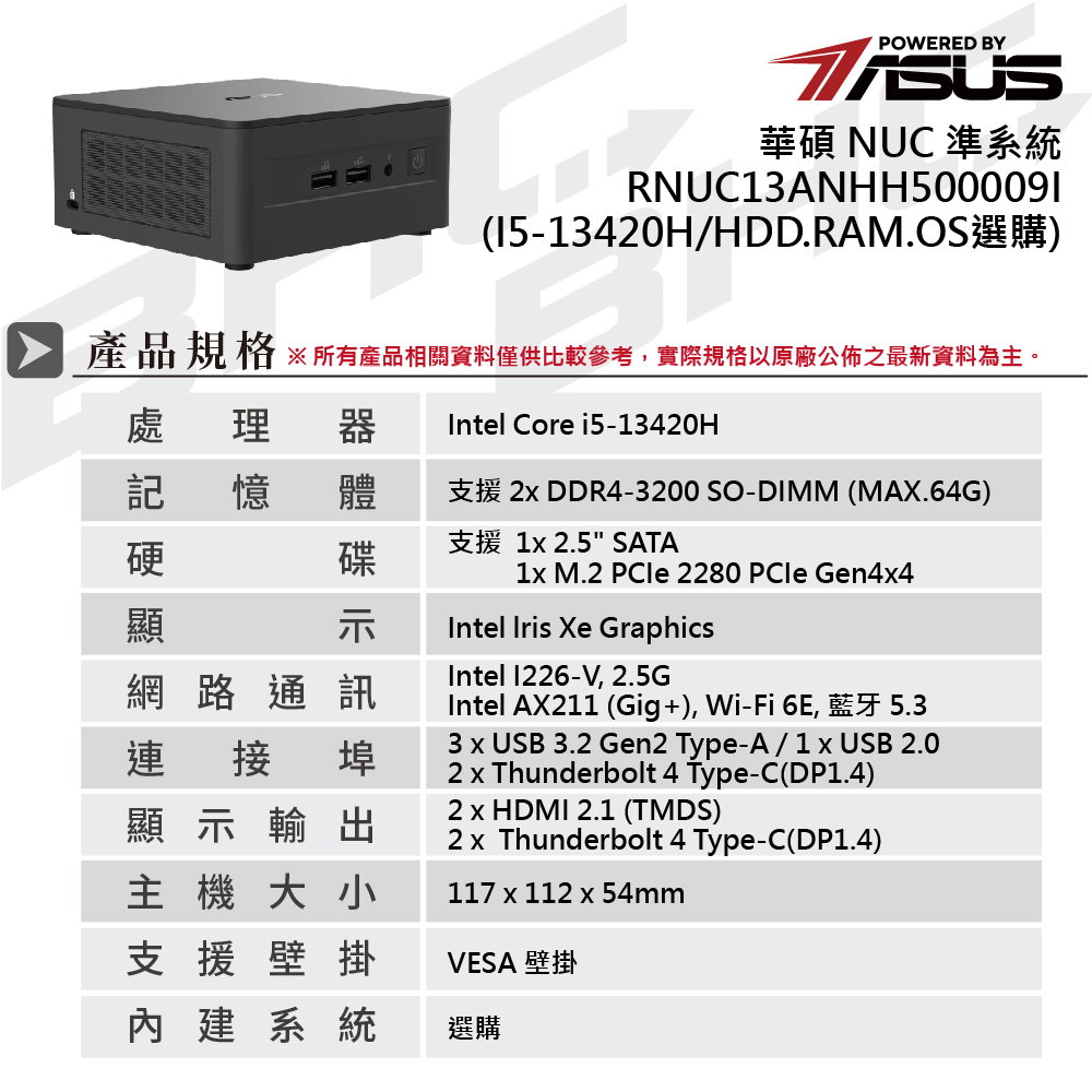 華碩 NUC 準系統 RNUC13ANHH500009I(I5-13420H/HDD.RAM.OS選購)