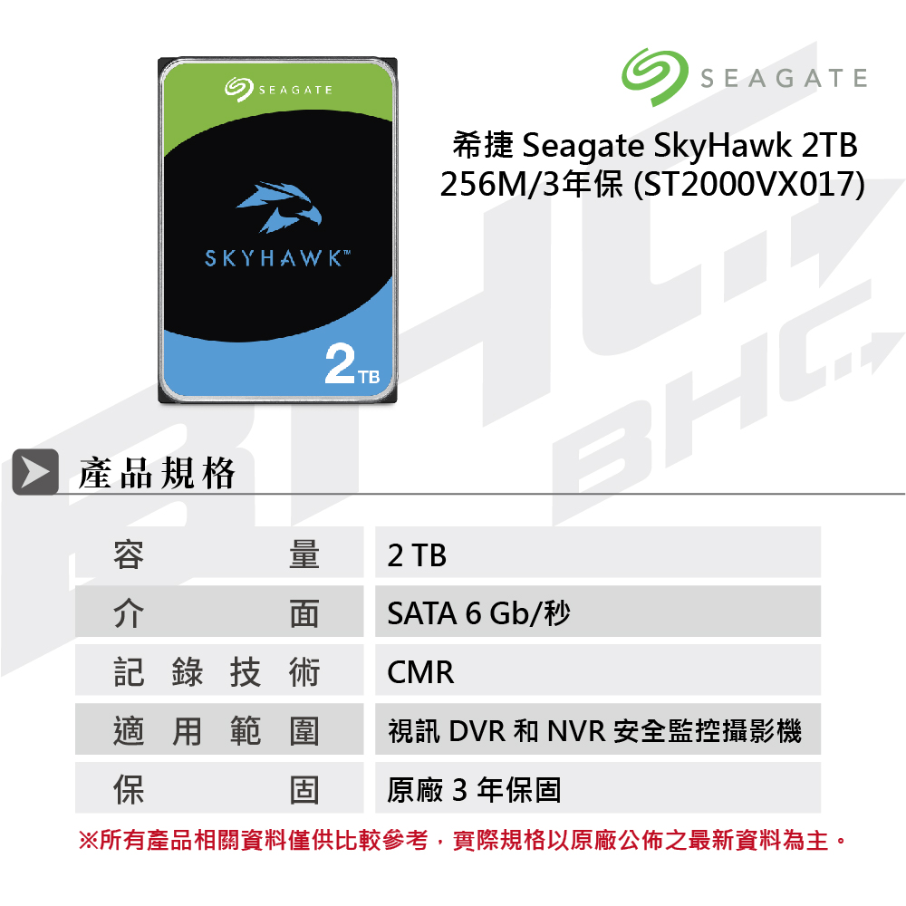 [限組裝]希捷 Seagate 2TB(監控鷹) 5400轉/256M/SkyHawk /3Y(ST2000VX017)