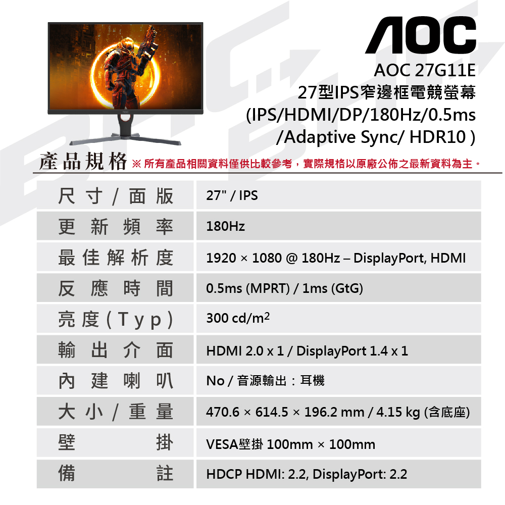 AOC 27G11E 27型IPS電競液晶螢幕(HDMI/DP/180Hz/HDR10)無喇叭