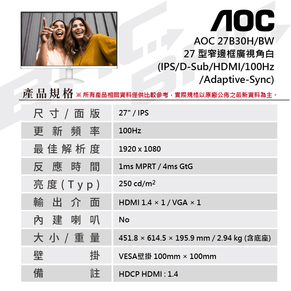 AOC 27B30H/BW 27型IPS窄框液晶螢幕(D-Sub/HDMI/100Hz/Adaptive-Sync)無喇叭 白