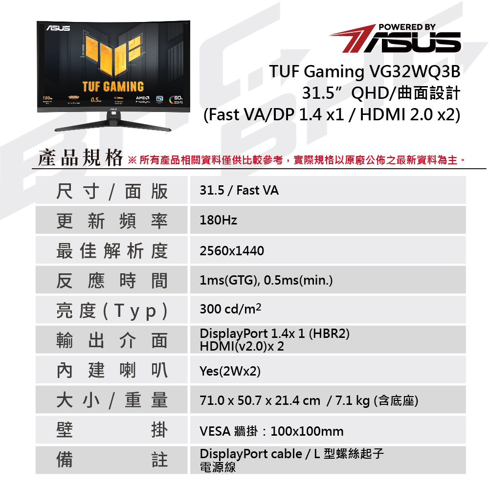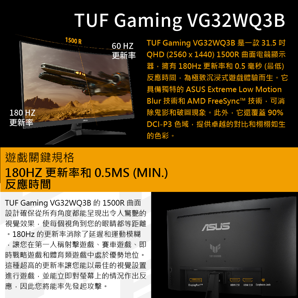 華碩 TUF VG32WQ3B(HDMI*2/DP1.4*1/曲面/1500R/180Hz/含喇叭/HDR10)