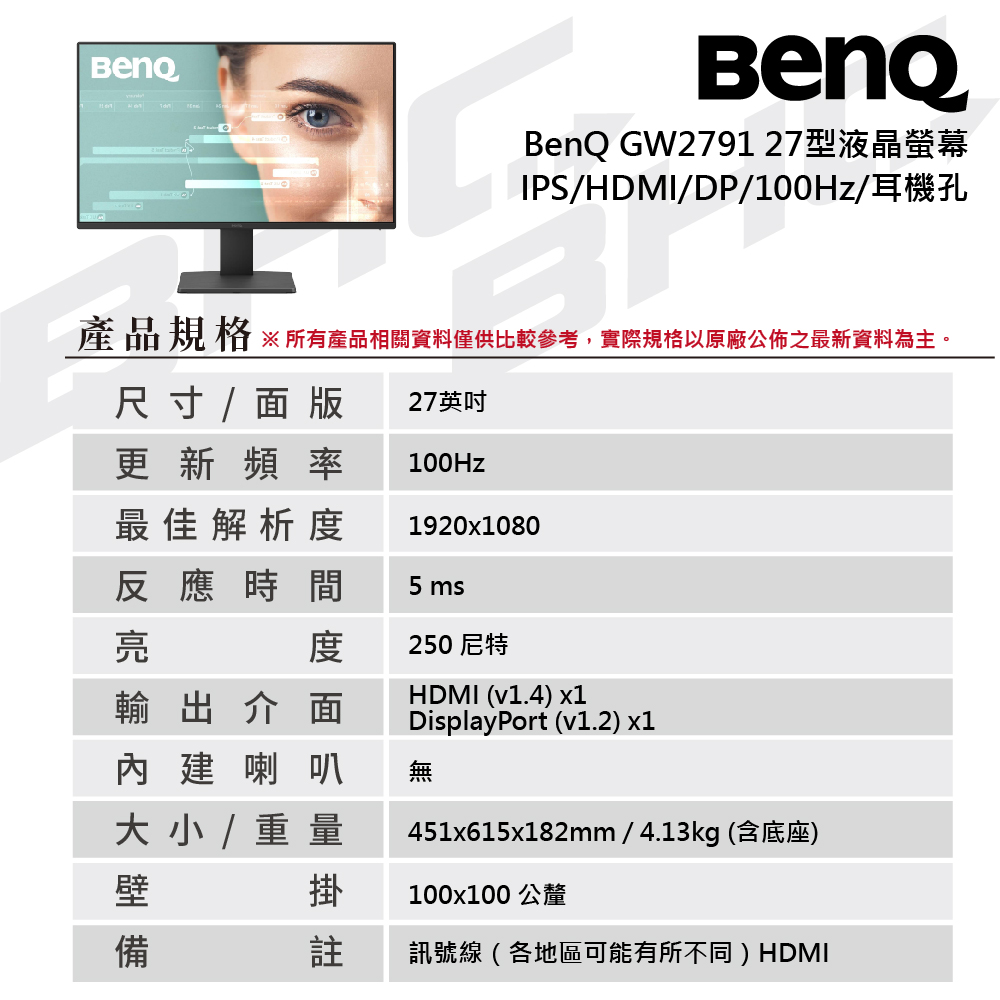 BenQ GW2791(HDMI/DP/100Hz/耳機孔)IPS 27型液晶螢幕