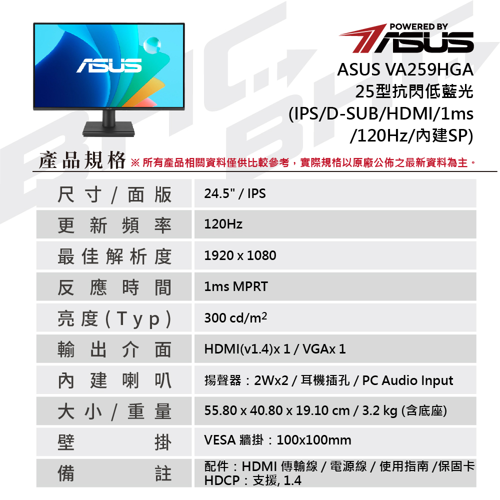 ASUS華碩 VA259HGA 25吋IPS液晶螢幕(D-SUB、HDMI/1ms/120Hz/含喇叭)低藍光