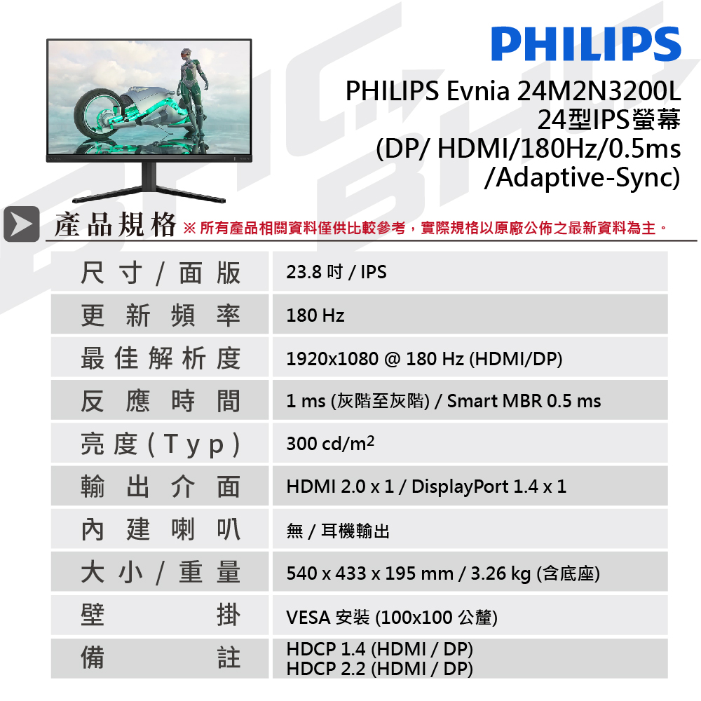 PHILIPS 飛利浦 Evnia 24M2N3200L 24型(DP/ HDMI/180Hz/0.5ms/Adaptive-Sync)IPS螢幕