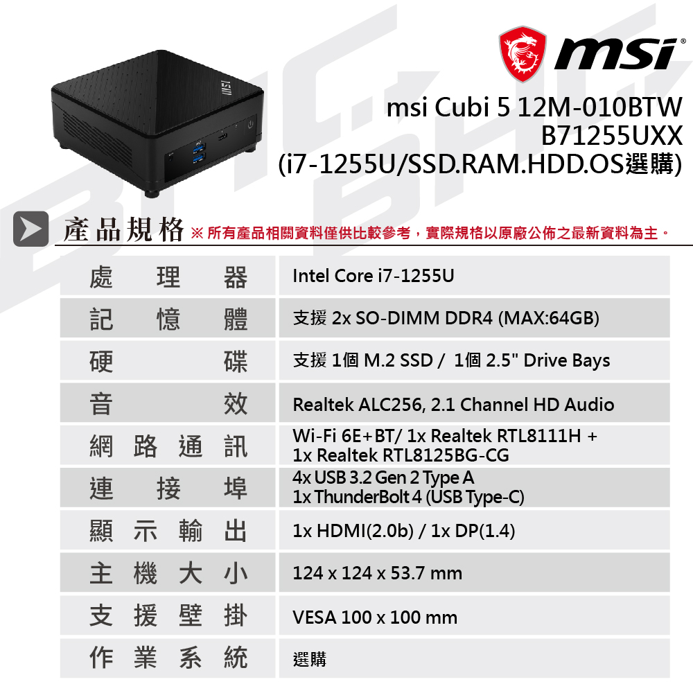 [搭購價]微星msi Cubi 5 12M-010BTW-B71255UXX(i7-1255U/SSD.RAM.HDD.OS選購)黑