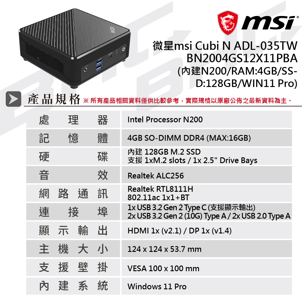微星msi Cubi N ADL-035TW-BN2004GS12X11PBA(內建N200/RAM:4GB/SSD:128GB/WIN11 Pro)