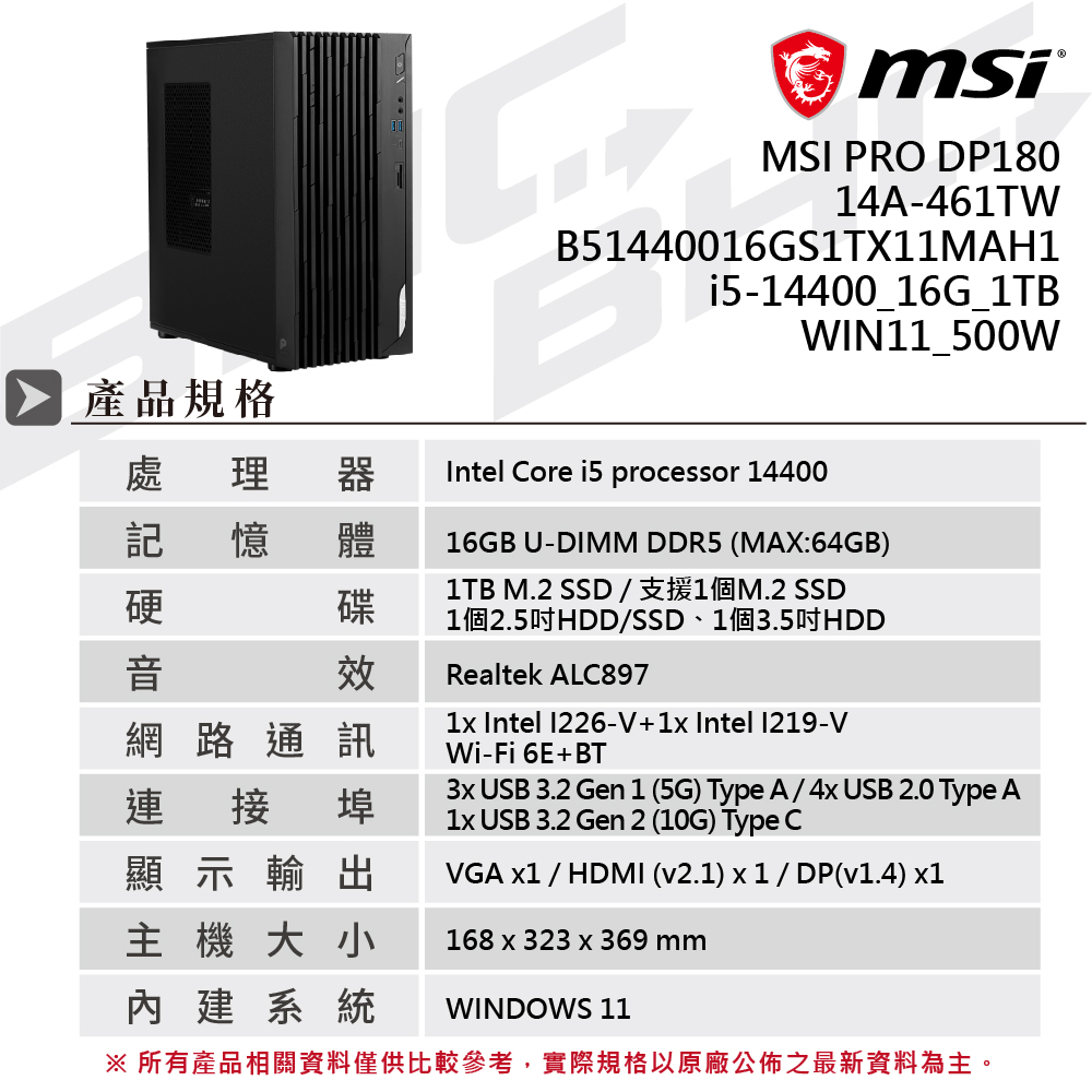 微星 msi PRO DP180 14A-461TW-B51440016GS1TX11MAH1(Intel I5-14400/16G/1T/WIN11)