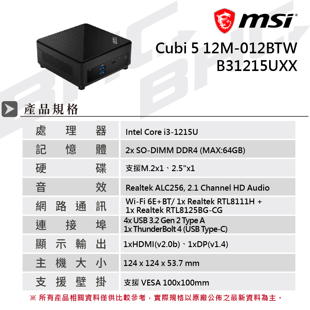 [搭購價]微星msi Cubi 5 12M-012BTW-B31215UXX(i3-1215U/SSD.RAM.HDD.OS選購)黑