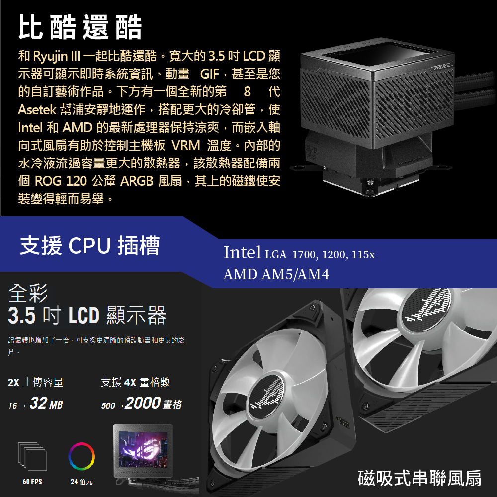 華碩 ROG RYUJIN III 360 ARGB 龍王三代/Asetek8代/磁吸卡扣風扇/6年 水冷散熱器