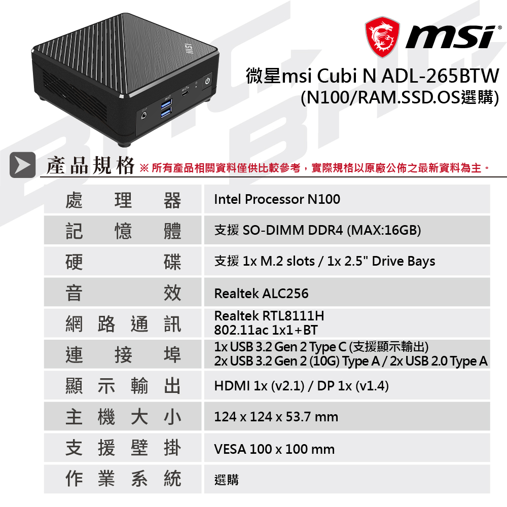 微星msi Cubi N ADL-265BTW-BN100XX(N100/SSD.RAM.HDD.OS選購)黑