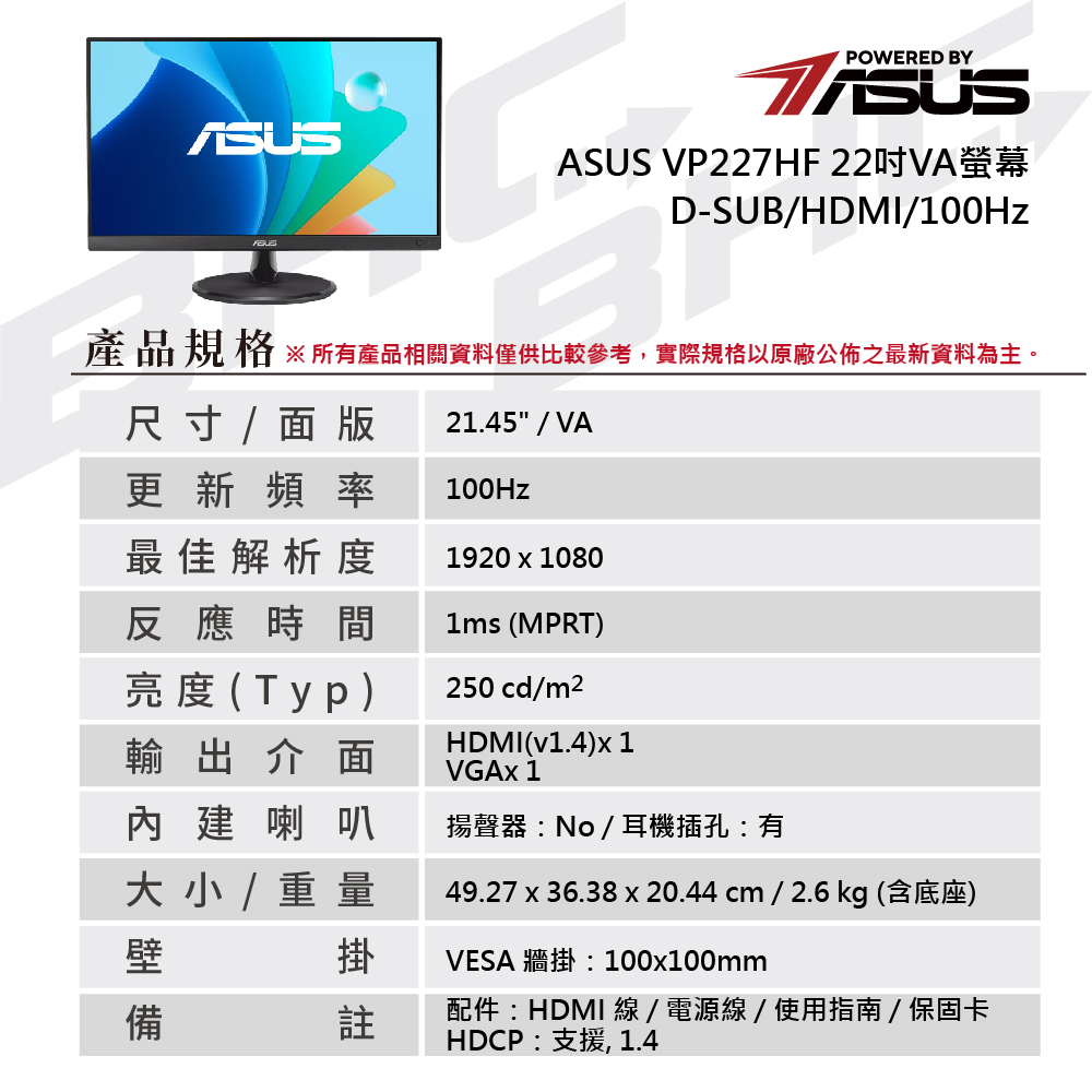 ASUS華碩 VP227HF/VA面板(D-SUB、HDMI/100Hz)