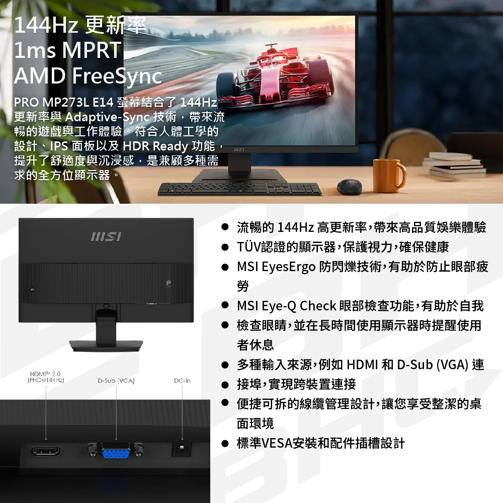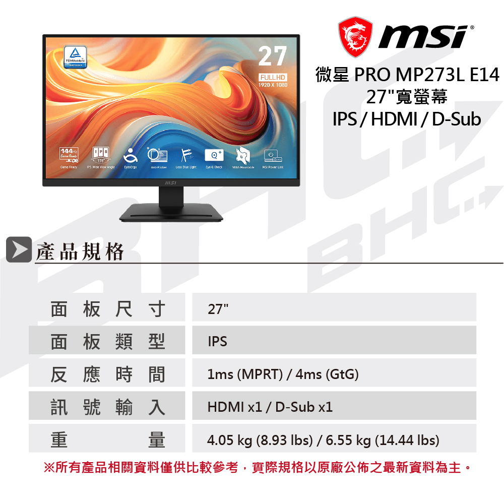 MSI 微星 PRO MP273L E14 (D-SUB/HDMI/1ms/144Hz/內建SP)27吋IPS低藍光液晶螢幕