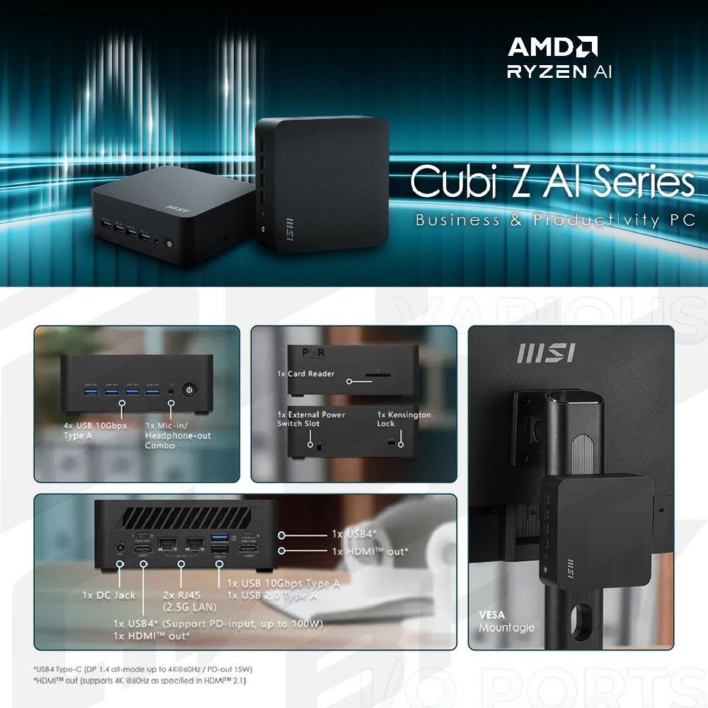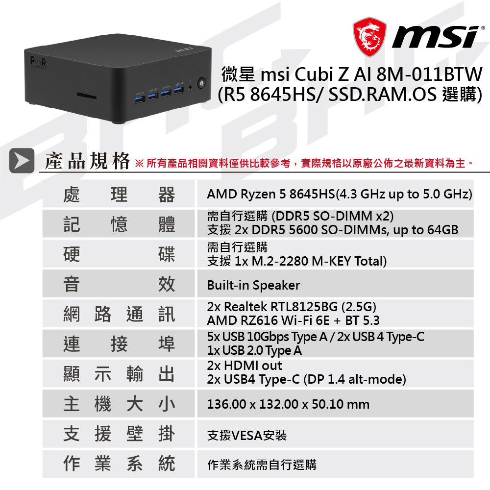 微星 CUBI Z AI 8M-011BTW-BAR58845SXX(AMD R5 8645HS【SSD.RAM.OS選購】)
