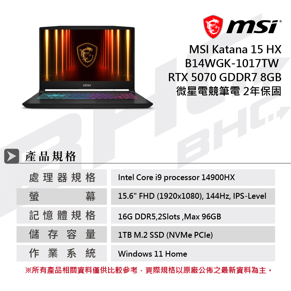 微星MSI Katana 15 HX B14WGK-1017TW 15.6吋筆電
