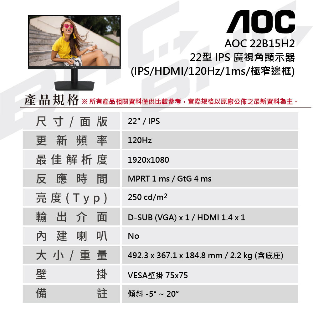 AOC 22B15H2 22型液晶螢幕IPS面板(D-SuB/HDMI1.4/120Hz)