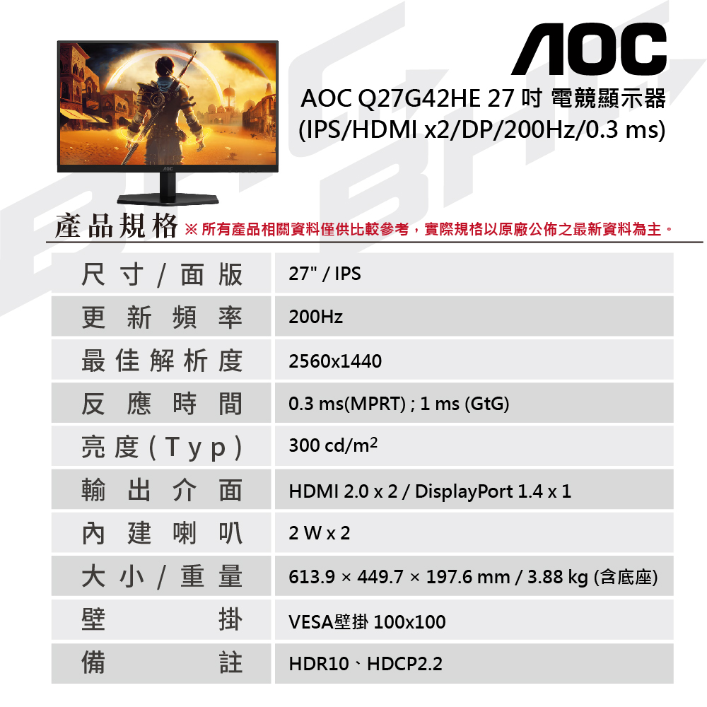 AOC Q27G42HE 27型IPS QHD液晶螢幕(HDMI*2/DP/200Hz/HDR10)含喇叭