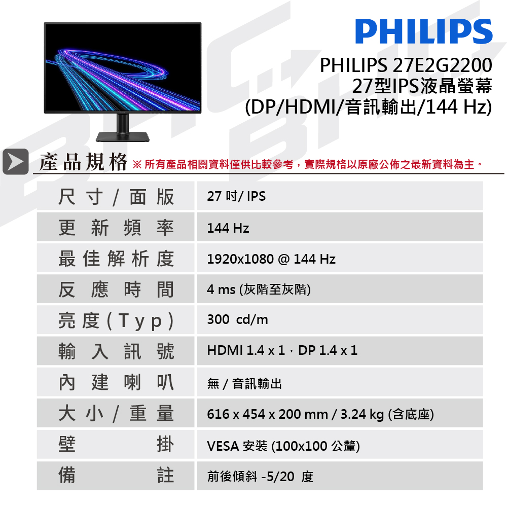 PHILIPS 飛利浦 27E2G2200/96 27型(HDMI/DP/144Hz//HDR 10/音效輸出孔)IPS液晶螢幕