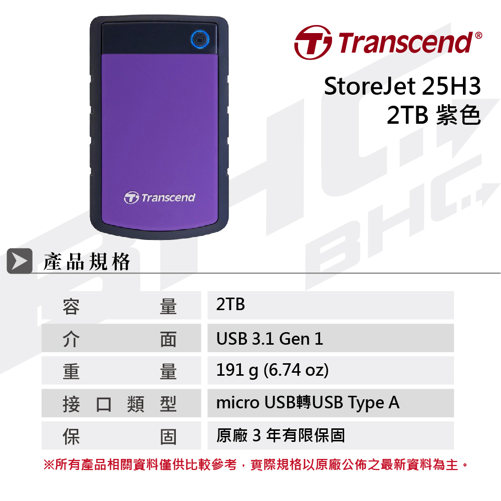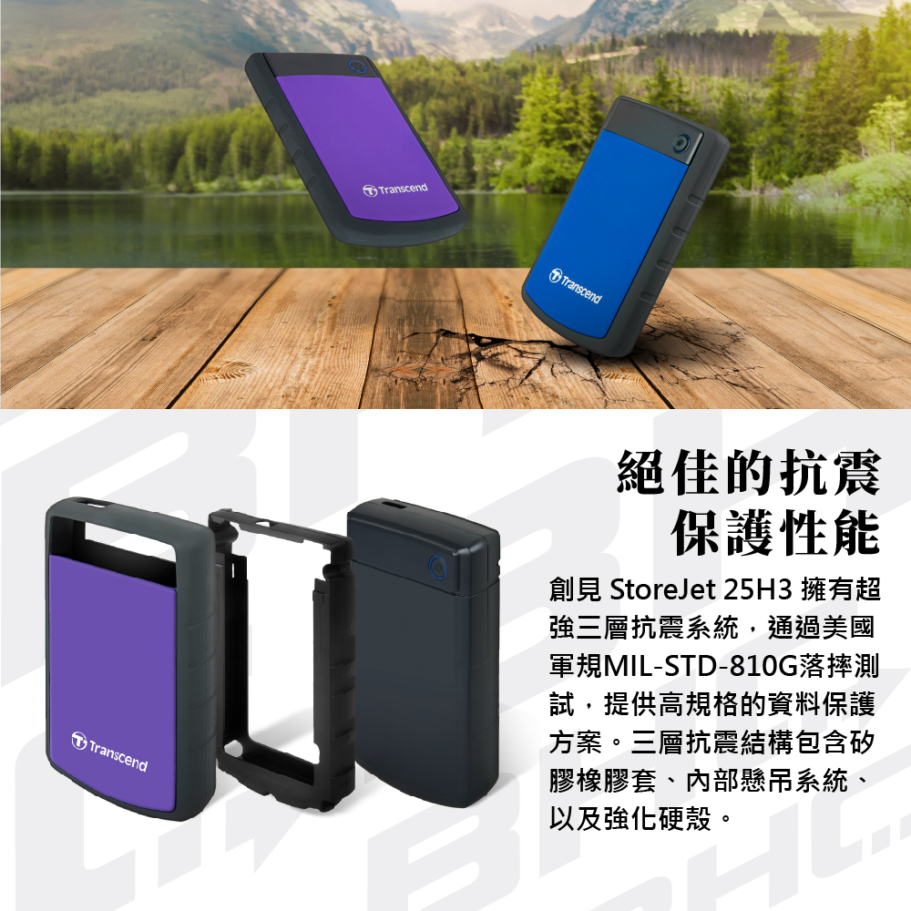 創見 StoreJet 25H3 2TB 紫色/Type-A/軍規/支援單鍵備份/3年保